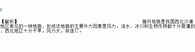 C 【解析】雅丹地貌是我國西北沙漠地區(qū)常見的一種地貌,形成該地貌的主要外力因素是風力,流水、冰川和生物作物都十分微薄的,西北地區(qū)十分干旱,風力大,故選C。科目:初中地理 來源:安徽省合肥市2017-2018學年上學期期末質(zhì)量檢測卷八年級地理試卷 題型:選擇題