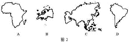 讀圖2—四大洲輪廓圖,完成12-13題。