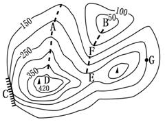 (1)寫出圖中字母代表的相應(yīng)地形部位的名稱:(每空1分共4分)