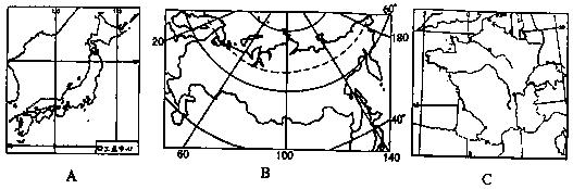 讀“某三個(gè)國(guó)家輪廓圖”,分析回答問題。(9分)
