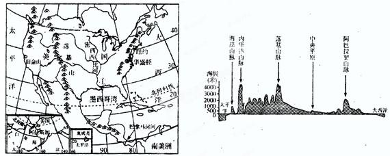 (3)讀“沿40°N的美國地形剖面圖”,描述美國地勢特征是 , 東部緩。