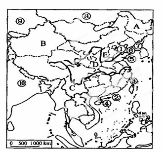 ⑴寫出下列數(shù)字代表的地理事物的名稱: