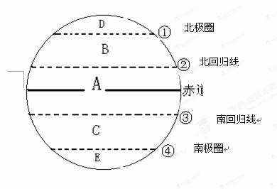 (1)地球五帶:A __________ B ___________C __________ D __________ E __________(2)北極圈是____ 帶和_____ 帶的分界線.