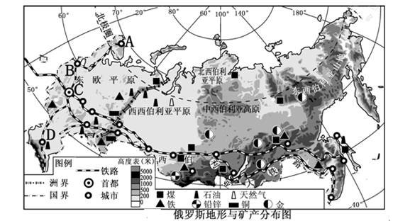讀圖“俄羅斯地形與礦產(chǎn)分布圖”,完成下列各題。