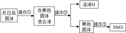 | 解答: | 解(1)分析流程圖可知,操作①是將剩余固體在水中充分溶解,故玻璃棒的作用是加速可溶性物質(zhì)溶解; (2)高錳酸鉀加熱生成錳酸鉀、二氧化錳和氧氣,故溶液中一定有錳酸鉀,由于不知高錳酸鉀是否完全分解,無法判斷是否含有高錳酸鉀; (3)過濾所需玻璃儀器包括燒杯、漏斗和玻璃棒; (4)要回收二氧化錳,分離出來后還要洗滌、干燥得到純凈的二氧化錳; 故答案為:(1)攪拌,加速溶解;(2)K2MnO4;(3)漏斗;(4)干燥. |