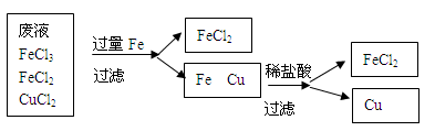 (3) 工業(yè)上制作印制板是利用氯化鐵腐蝕Cu的原理:反應(yīng)方程式為2FeCl3+Cu==2FeCl2+CuCl2。工業(yè)生產(chǎn)過程中產(chǎn)生的廢液對(duì)環(huán)境有污染,為了節(jié)約金屬資源并減少對(duì)環(huán)境的污染,請(qǐng)你設(shè)計(jì)一個(gè)實(shí)驗(yàn)流程處理廢液回收Cu和FeCl2 。