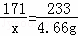 | 解答: | 解:(1)生成的BaSO4質(zhì)量為:40g+60g﹣95.34g=4.66 g; (2)設(shè)參加反應(yīng)的Ba(OH)2的質(zhì)量為x Ba(OH)2+H2SO4=BaSO4↓+2H2O 171 233 x 4.66 g