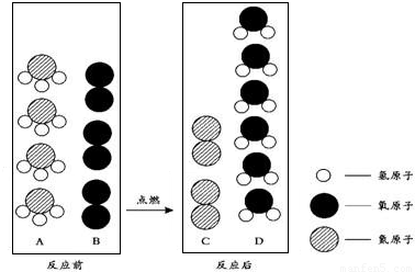 (2012?夾江縣二模)在點(diǎn)燃條件下,A和B反應(yīng)生成C和D.反應(yīng)前后分子變化的微觀示意圖如圖所示(注:圖示僅表示微粒種類(lèi)變化,不表示微粒數(shù)目變化).