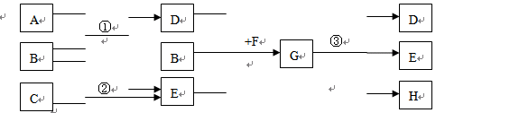 已知下列框圖中的A為天然氣的主要成分,C、F為常見固體單質(zhì),G為綠色粉末。它們相互之間存在下列轉(zhuǎn)化關(guān)系(反應(yīng)條件略)。試根據(jù)下圖所示的轉(zhuǎn)化關(guān)系回答下列問題: