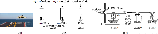 (4)遼寧艦的建造耗費了大量的鋼材.某興趣小組在實驗室用圖3所示裝置模擬煉鐵的化學原理,并測定赤鐵礦中氧化鐵的質(zhì)量分數(shù)(裝置氣密性良好,反應完全且赤鐵礦中的雜質(zhì)不參加反應,稱重赤鐵礦樣品的質(zhì)量為wg).