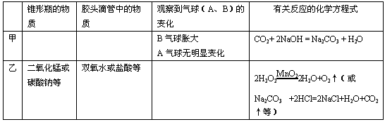 | 錐形瓶中的物質(zhì) | 膠頭滴管中的物質(zhì) | 觀察到氣球(A、B)的變化 | 有關反應的化學方程式 | |