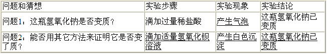 | 問(wèn)題1:這瓶氫氧化鈉是否變質(zhì)? | 滴加過(guò)量稀鹽酸 | 產(chǎn)生氣泡 |