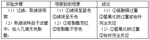 | (1)過(guò)濾、取濾液觀察 (2)取濾液樣品于試管中,加入幾滴無(wú)色酚酞試液 | (1)①濾液呈藍(lán)色 ②濾液無(wú)色 (2)①若酚酞變紅 ②______ | (1)①______ ②______ (2)①______ ②______ |