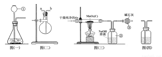 (3)圖(三)是用干燥純凈的O2與樣品反應(yīng)來測定二氧化錳質(zhì)量分?jǐn)?shù)的裝置,裝置③中裝有堿石灰,其作用是____________________________________________________。