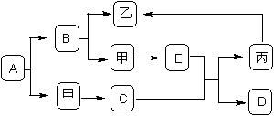 下圖是初中化學(xué)中常見物質(zhì)間的轉(zhuǎn)化關(guān)系,其中甲、乙、丙為單質(zhì);A、B、C、D、E為化合物,且A與B的組成元素相同,D與E的組成元素也相同。已知C、丙均為黑色粉末,C和E在高溫條件下可生成丙和D,D能使澄清的石灰水變渾濁。其余反應(yīng)條件、部分反應(yīng)物和生成物均已略去。試推斷:
