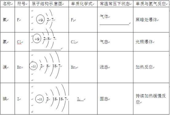 | 名稱 | 符號 | 原子結(jié)構(gòu)示意圖 | 單質(zhì)化學式 | 常溫常壓下狀態(tài) | 單質(zhì)與氫氣反應(yīng) |