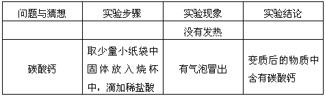 | 問(wèn)題1、小紙袋中的物質(zhì)能否繼續(xù)作干燥劑 ______ | 取足量小紙袋中的固體放入燒杯中,加入適量水,觸摸杯壁 | ______ | 不能做干燥劑 |
