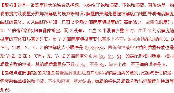 D.t2 ℃時,三種物質(zhì)的飽和溶液中溶質(zhì)的質(zhì)量分數(shù)X>Y>Z