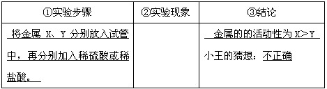 | _________________________ _________________________ _________________________ _________________________ _________________________ | 金屬Y表面無明顯變化,金屬X的表面有氣泡冒出. 將燃著的木條放在裝金屬X的試管口,氣體燃燒. | _________________________ _________________________ 小王的猜想:(填“正確”或“不正確”) |