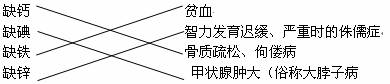 化學(xué)元素和人體健康有著密切的聯(lián)系。請將下列元素和人體健康的關(guān)系連線。所缺元素種類 引發(fā)健康問題缺鈣 貧缺碘 智力發(fā)育遲緩、嚴(yán)重時(shí)的侏儒癥缺鐵 骨質(zhì)疏松、佝僂病缺鋅 甲狀腺腫大(俗稱大脖子。