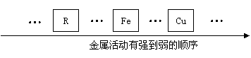(3)請(qǐng)根據(jù)上述的信息,標(biāo)出金屬Fe、R、Cu在下列金屬活動(dòng)性順序表中的相應(yīng)位置。
