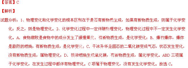 A.食物腐敗 B.爆竹爆炸 C.干冰升華 D.鎂帶燃燒