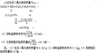 微型化學(xué)實(shí)驗(yàn)使用藥品的量很少,產(chǎn)生的廢棄物也很少,因此被譽(yù)為綠色環(huán)保的化學(xué)實(shí)驗(yàn)。用右圖微型儀器完成制取并檢驗(yàn)CO2的實(shí)驗(yàn)只消耗了0.55 g 10%的鹽酸。求: