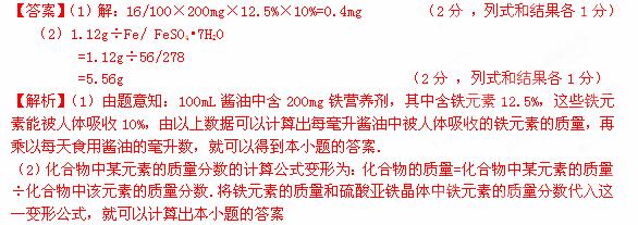 (1)一種添加了營養(yǎng)劑的“鐵強化”醬油已經(jīng)面市。根據(jù)衛(wèi)生部鐵強化劑添加標(biāo)準(zhǔn),每100mL醬油中鐵營養(yǎng)劑添加量是200mg,該營養(yǎng)鐵元素質(zhì)量分?jǐn)?shù)為12.5%。根據(jù)實驗測得,醬油中鐵只有10%能被人體吸收,以某人一天使用16mL該醬油計算,他一天從醬油中吸收的鐵元素是多少毫克?