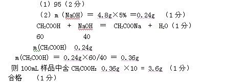 某化學(xué)研究性學(xué)習(xí)小組為測(cè)定市場(chǎng)出售的食醋總酸量(國家規(guī)定食醋中總酸量3.5g/100mL~5g/100mL),擬配制一定質(zhì)量分?jǐn)?shù)的氫氧化鈉溶液,然后進(jìn)行測(cè)定。請(qǐng)你參與該小組的實(shí)驗(yàn)研究,并回答相關(guān)問題。(1)配制100g質(zhì)量分?jǐn)?shù)為5%的氫氧化鈉溶液需要水 mL(水的密度為1g/cm3)。(2)若食醋中的酸均看成是醋酸,醋酸與氫氧化鈉反應(yīng)的方程式為: CH3COOH + NaOH = CH3COONa + H2O 現(xiàn)有食醋500mL,甲同學(xué)從中取出10mL食醋,加入5%的氫氧化