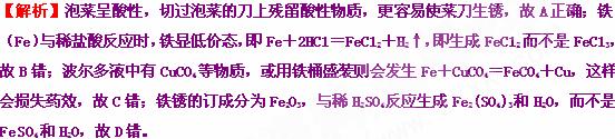 A.切過(guò)泡菜的菜刀比置于潮濕空氣中的菜刀更易生銹 B.鐵與稀鹽酸反應(yīng),生成FeCl3和H2