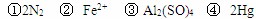 ①2個(gè)氮分子___ __ ②亞鐵離子_____③硫酸鋁_____ ④2個(gè)汞原子__ _