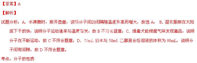 | C.50ml水和50ml酒精相混合,總體積小于100ml —— 分子間有間隙 |