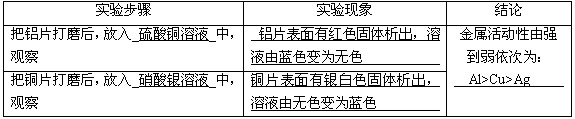 | 把鋁片打磨后,放入________中,觀察 | ________ | 金屬活動性由強(qiáng)到弱依次為: ________ |