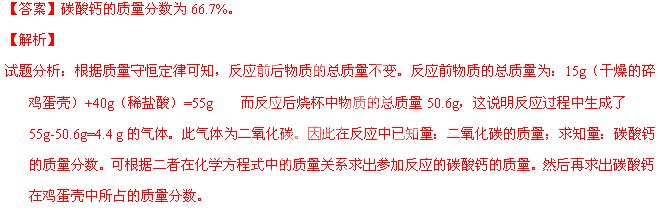 雞蛋殼的主要成分是碳酸鈣。某學生想測定雞蛋殼中碳酸鈣的質(zhì)量分數(shù),取15g干燥的碎雞蛋殼放入燒杯中,向其中加入了40g稀鹽酸恰好完全反應(假設雞蛋殼中除碳酸鈣外的其他成分都不溶于水,且不與稀鹽酸反應),反應后燒杯中物質(zhì)的總質(zhì)量50.6g。計算雞蛋殼中碳酸鈣的質(zhì)量分數(shù)(結果保留1位小數(shù))。