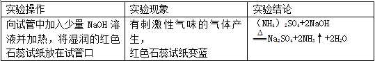 | 取該溶液少許于試管中, 向試管中加入少量NaOH溶液并加熱, 向試管中加入少量NaOH溶液并加熱, 將濕潤(rùn)的紅色石蕊試紙放在試管口 將濕潤(rùn)的紅色石蕊試紙放在試管口 |
