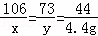 解得:x=10.6g,y=7.3g (3)稀鹽酸中溶質(zhì)的質(zhì)量分?jǐn)?shù)為: 答:(3)稀鹽酸中溶液的質(zhì)量分?jǐn)?shù)7.3%. 故答案為:(1)4.4; (2)10.6; (3)7.3%. |