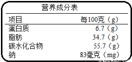 (1)營養(yǎng)成分表中的“鈉83mg”,是指 ;