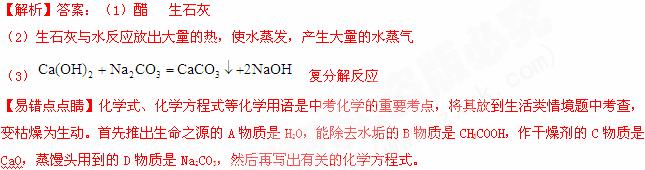 A、B、C、D四種化合物,在日常家庭生活中都得到廣泛應(yīng)用。其中A、B通常情況下為液體,C、D為固體。A是生命之源,人們每天都必須飲用它;B是一種調(diào)味品的主要成分,用該調(diào)味品可除去水壺中的水垢;C常用作干果的干燥劑;把D加入經(jīng)發(fā)酵后的面團中,使蒸出的饅頭松軟可口;卮鹣铝袉栴}: