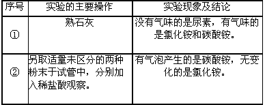 | ① | 分別取適量三種白色固體粉末于研缽中,加入_______后,研磨,聞氣味. | |