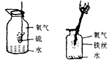 | 請結(jié)合硫、鐵分別在氧氣中燃燒的實驗,回答下列問題: (1)鐵絲在氧氣中燃燒的現(xiàn)象是__________________并放出熱量; (2)請分別說明做這兩個實驗時,預(yù)先向集氣瓶中裝少量水的作用:____________________。 |
