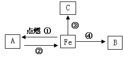 | (1)A物質(zhì)的化學(xué)式為 。 (2)B物質(zhì)的一種用途是 。 (3)反應(yīng)②還需要的一種反應(yīng)物是 (填化學(xué)式)。 (4)寫出反應(yīng)③的化學(xué)方程式,并注明基本反應(yīng)類型: ( )。 | ||