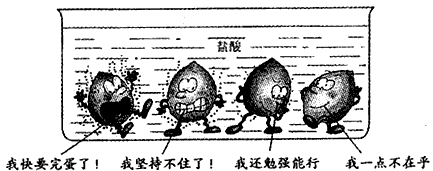 Fe、Cu、Mg、Zn是幾種金屬活動(dòng)性不同的金屬,將它們同時(shí)放入稀鹽酸中,出現(xiàn)了下圖表示的情景。請(qǐng)分析它們的表白后填寫下列空白。