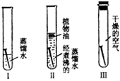 | (1)導管中水面為什么會上升? _________ . (2)上述實驗中,鐵生銹的速率由大到小的排列順序為(填小燒杯號): _________ . (3)影響鐵生銹的因素有: _________ . |