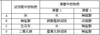 | 如圖所示。若在試劑瓶中放入某種物質(zhì),先滴加滴管1中液體后,小氣球變鼓,再滴加滴管2中液體后,小氣球又變癟。下列與所描述現(xiàn)象相符的一組是 |