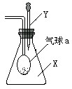 下圖中錐形瓶內(nèi)充滿干燥氣體X,滴管內(nèi)盛有液體Y。將滴管內(nèi)的液體擠壓到錐形瓶中,輕輕振蕩,一會可見小氣球鼓漲,X、Y可能是哪些物質(zhì)?請將相應(yīng)物質(zhì)的化學(xué)式填入下表中。