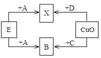 有A、B、C、D、E五種物質(zhì),在常溫下A、B、C是氣體,D是黑色固體,E是液體;其中C和D內(nèi)含同一種元素;B和E內(nèi)含有同一種元素,A、C、E內(nèi)含有同一種元素。五種物質(zhì)間的轉(zhuǎn)變關(guān)系如下圖: