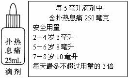 4歲的小英耳朵有點痛,需要服用補(bǔ)熱息痛糖漿或滴劑(糖漿與滴劑的作用相同),而家里只有撲熱息痛滴劑。對于一個4歲的兒童來說,服用糖漿的安全用量為6毫升(見下圖)。則服用多少毫升的滴劑等于服用了6毫升用量的糖漿( )