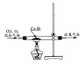 某同學(xué)設(shè)計圖裝置,欲凈化從儲氣瓶中排出的混有少量O2的CO。如果連接處和加熱管氣密性均良好,且氧化銅可以發(fā)生與“氧化鐵被一氧化碳還原成鐵”類似的反應(yīng)。試回答下列問題。