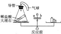 某同學(xué)用如圖所示的裝置驗(yàn)證質(zhì)量守恒定律時(shí),將錐形瓶?jī)A斜,使稀鹽酸與大理石接觸,待充分反應(yīng)后,發(fā)現(xiàn)天平指針指向 (填“a方向”、“b方向”或“O”),其原因是: 。