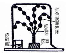 (1)打開(kāi)盛裝濃硝酸的試劑瓶,立即觀察到瓶口有白霧產(chǎn)生。據(jù)此可知,濃硝酸具有_______________(填一條物理性質(zhì))。為進(jìn)一步證明濃硝酸具有該性質(zhì),興趣小組設(shè)計(jì)如下裝置(脫脂棉團(tuán)因噴有稀氫氧化鈉與酚酞混合液而呈紅色)進(jìn)行實(shí)驗(yàn),實(shí)驗(yàn)過(guò)程中將觀察到的現(xiàn)象是_____________________,發(fā)生反應(yīng)的化學(xué)方程式為_(kāi)___________________。